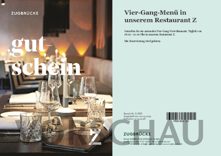 Ein saisonales Vier-Gang-Verwöhnmenü genießen. Täglich von 18.00 - 22.00 Uhr im Restaurant Z. Um Reservierung wird gebeten.